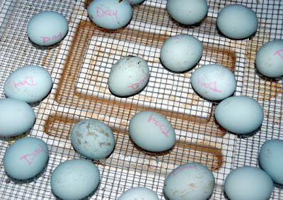 I must admit to not being a very diligent breeder. If I were, I'd have three or four pens of chickens, and I'd be rotating my two blue roos among my blue hens and tracking what the offspring looked like and what they layed. Instead, I've got all my chickens together, blue and pied, hens and roosters. A week before leaving on vacation, I collected all the blue eggs and placed them in the incubator. Since I've not got an automatic turner, the hatch rate will likely be low. But who knows? They're due to hatch on the 28th of this month.